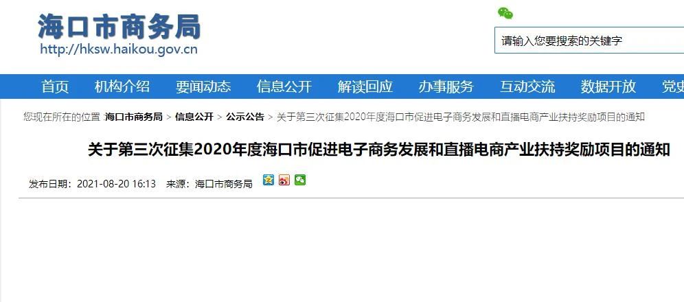 8月20日??谑猩虅站钟“l(fā)通知,面向社會公開征集:2020年度??谑写龠M電子商務發(fā)展扶持項目、2020年度海口市支持發(fā)展直播電商產(chǎn)業(yè)扶持獎勵項目。符合條件的相關企業(yè)及機構、個人按照有關要求申報。